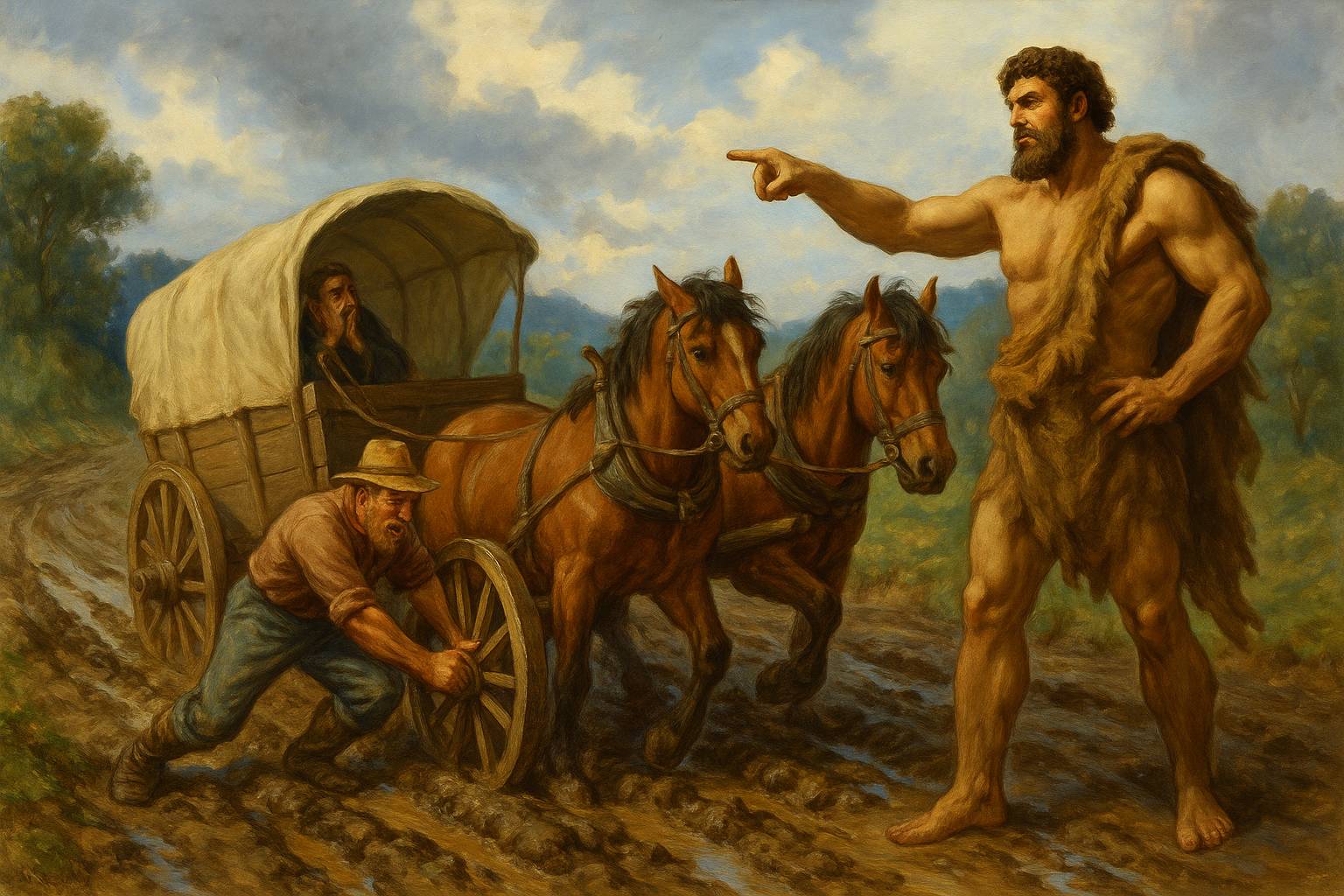 Once upon a time, a farmer’s wagon was stuck in the mud after a heavy rain.